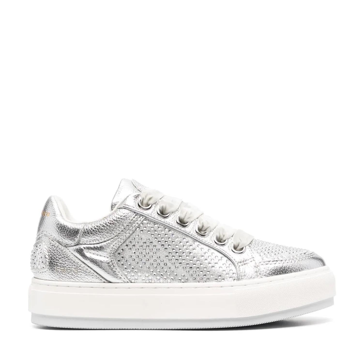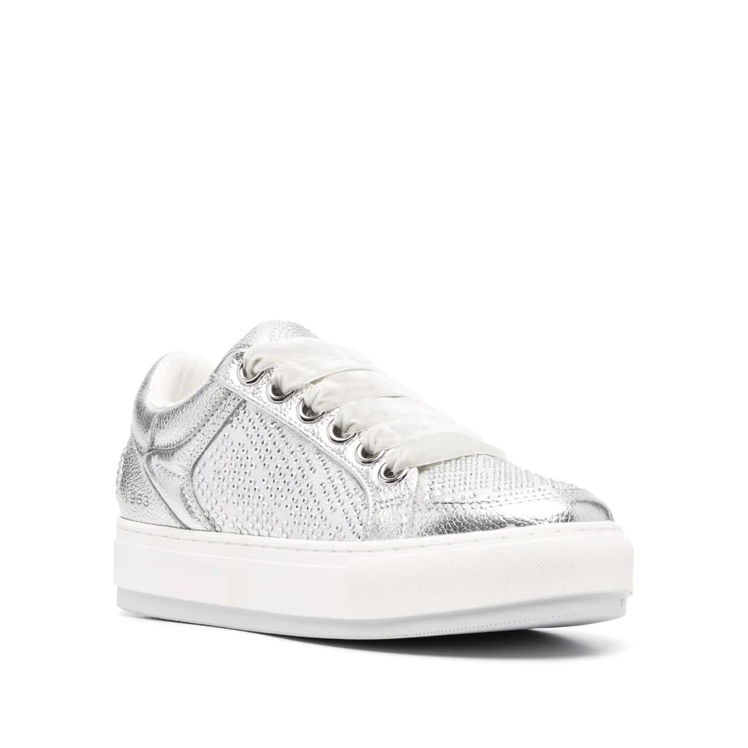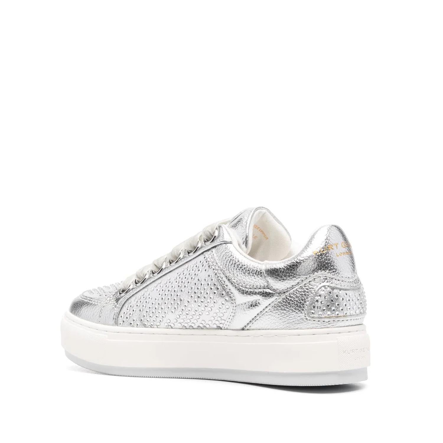 crystal-embellished metallic sneakers from Kurt Geiger London featuring silver-tone, calf leather, metallic effect, crystal embellishment, logo stamp to the rear, padded ankle, front lace-up fastening, round toe and flat rubber sole.