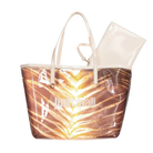 JUST CAVALLI Women's gold beach bag with a dramatic, super-summery design. Crafted from transparent material with a tropical print, it's finished with gold-finish trim and double handles for a glamorous touch. Spacious and lightweight, it's ideal for the beach or pool, perfect for holding a towel, sunscreen, and accessories. A matching gold-finish internal pouch completes the look, convenient for keeping smaller items safe. A beach bag that combines functionality and iconic style. Dimensions: 35 x 32 x 18 cm