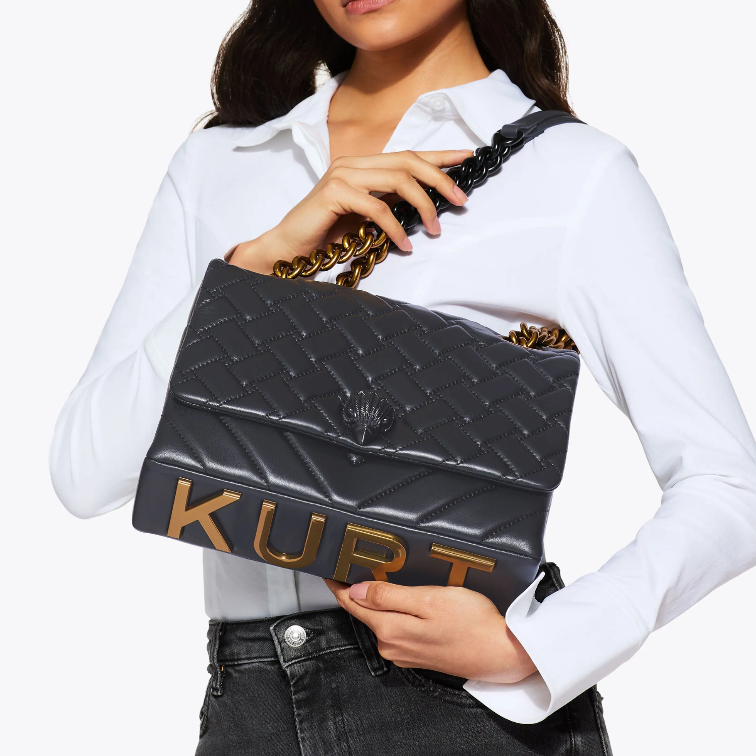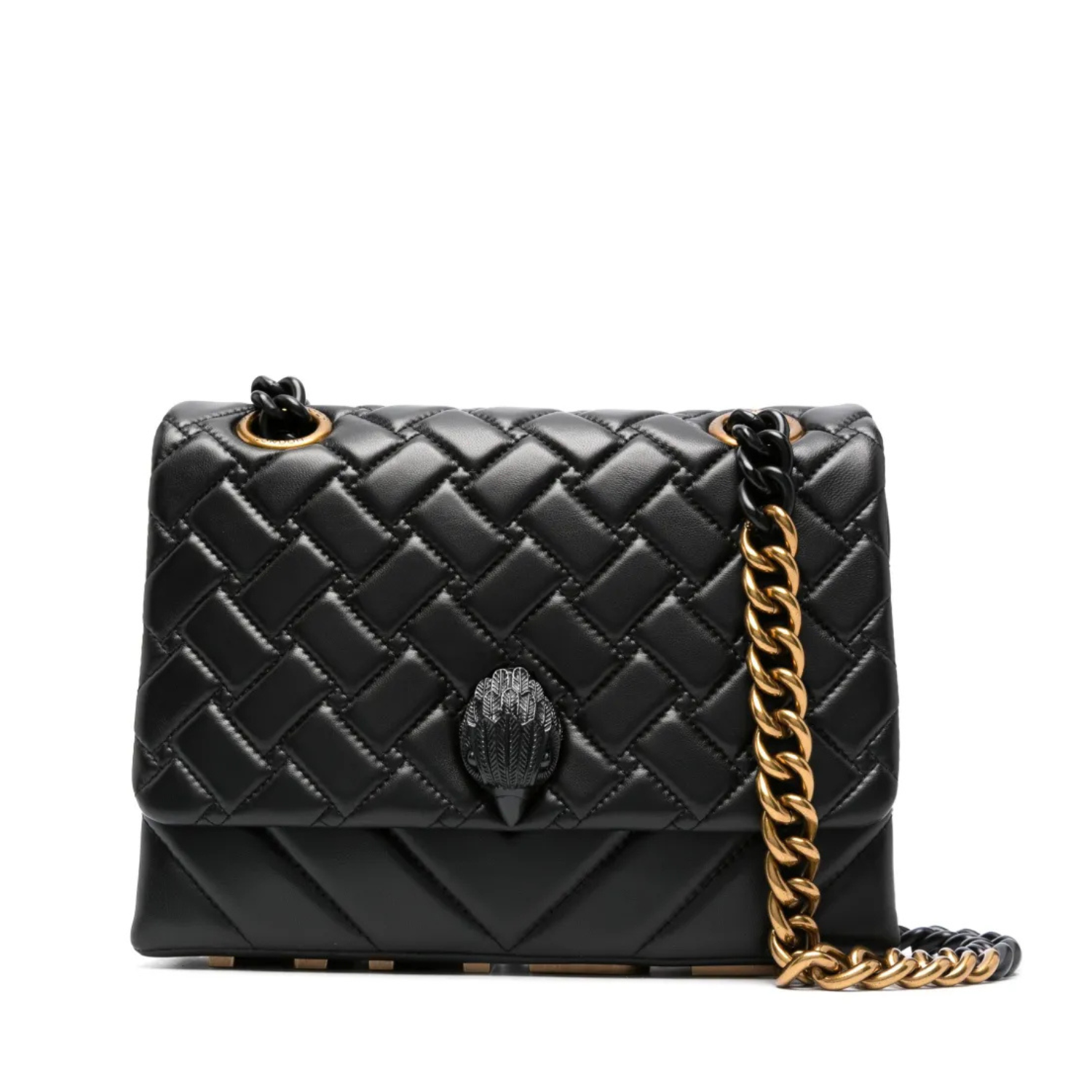 The Kensington Kurt is crafted from a black lambskin leather with overstitch quilt pattern. The black Eagle head features crystals on the front flap. The bottom of the purse features an antiqued brass 'KURT'.