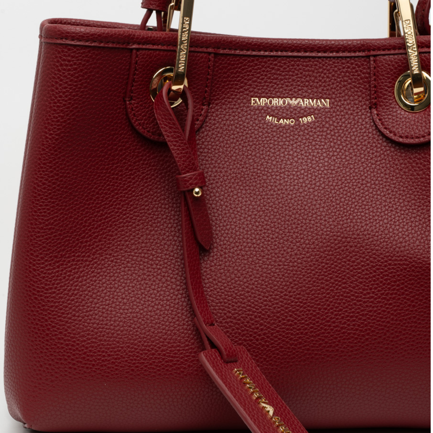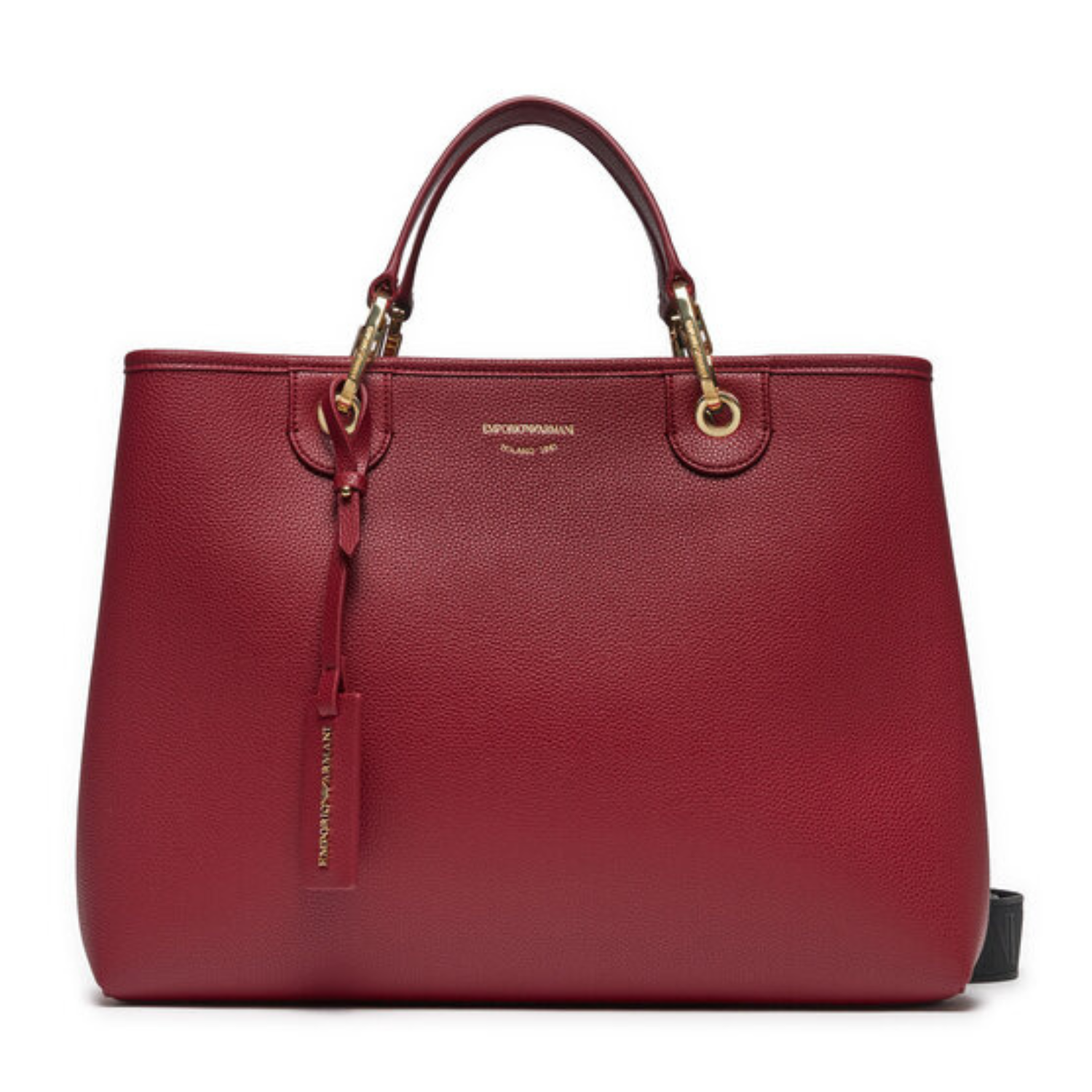 Burgundy embossed-logo tote bag from EMPORIO ARMANI featuring gold-tone hardware, embossed logo to the front, two rounded top handles, magnetic fastening and logo shoulder strap.