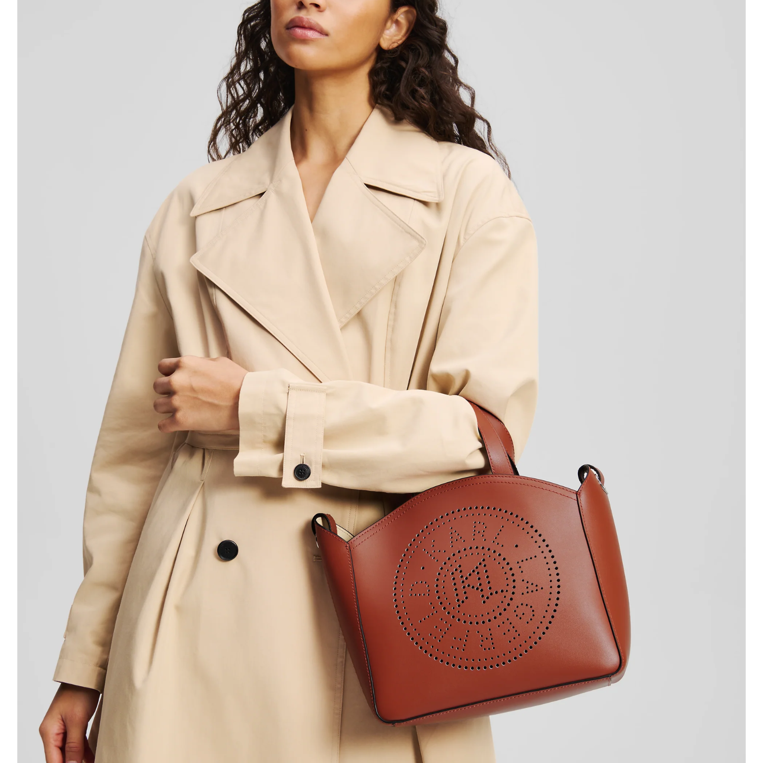 K/Circle perforated tote bag from KARL featuring brown , leather, perforated logo detail, scallop edge, logo shoulder strap and two top handles