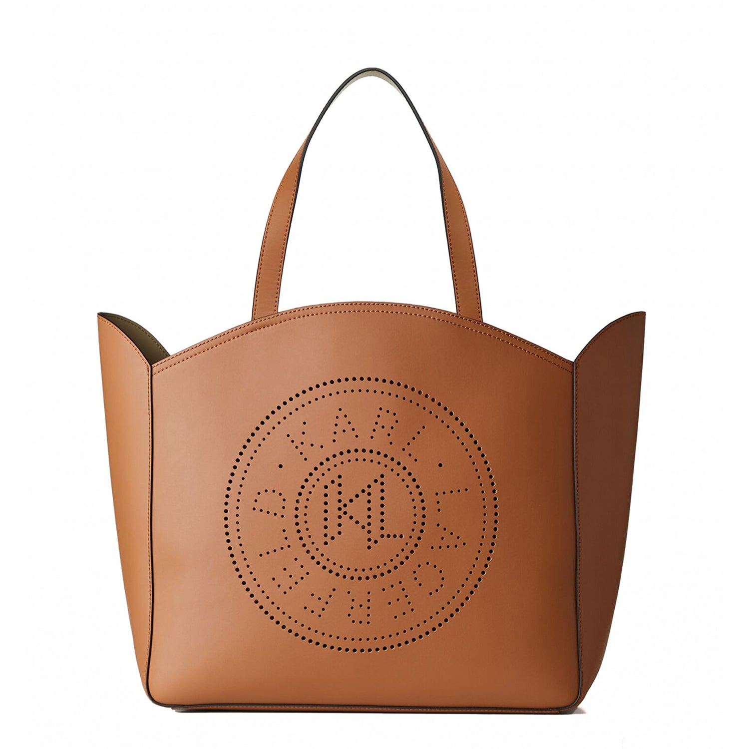 K/Circle perforated tote bag from KARL LAGERFELD featuring brown, leather, perforated logo detail, scallop edge, logo shoulder strap and two top handles.