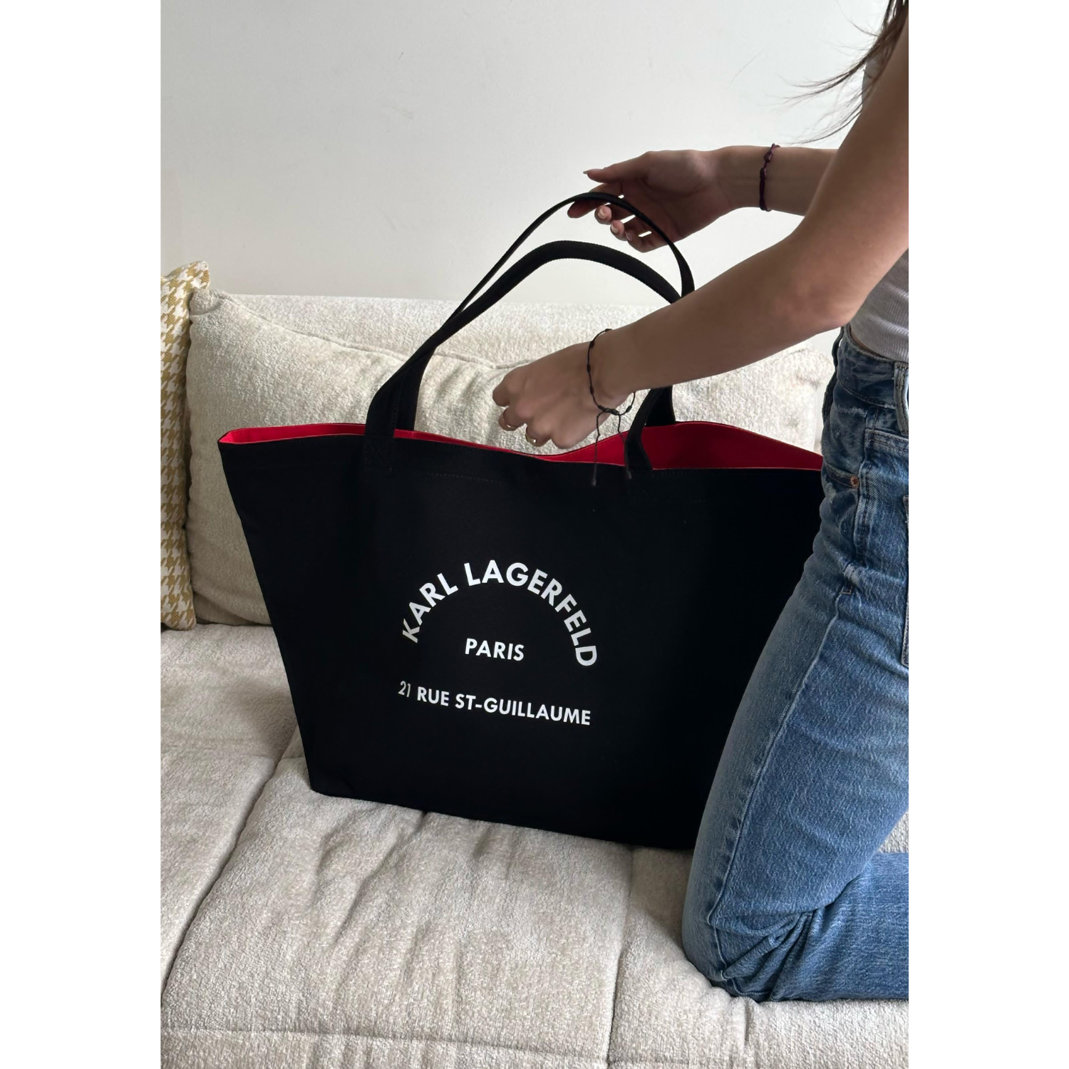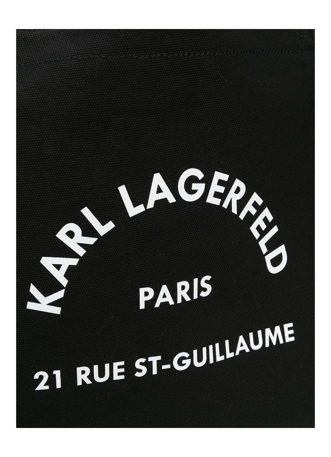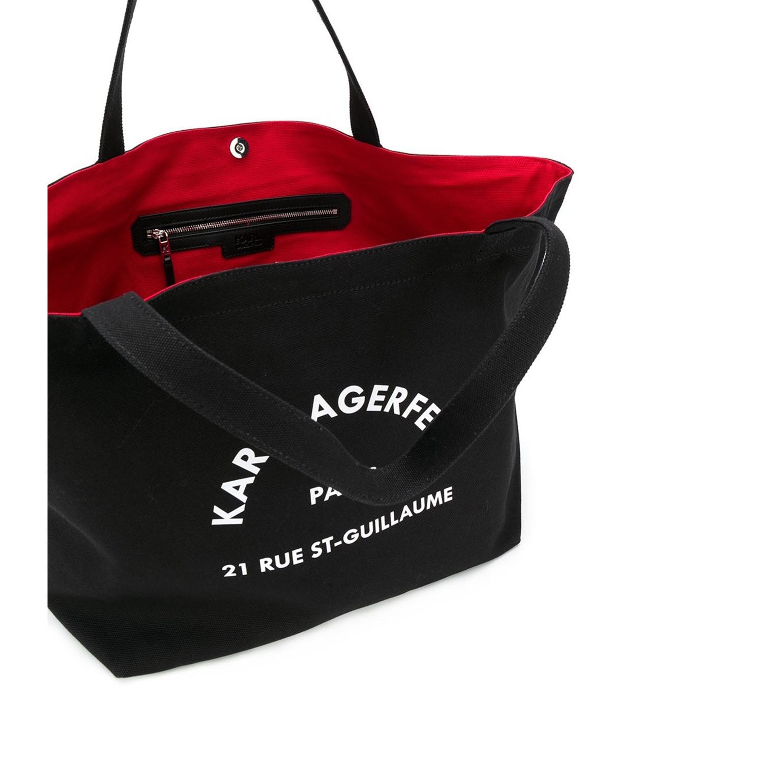 - Black cotton logo-print tote bag from Karl Lagerfeld featuring a printed logo to the front, a snap button closure, top handles, a main internal compartment, an internal zipped pocket and a printed logo