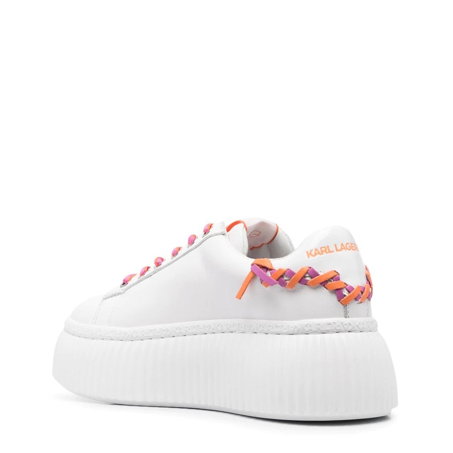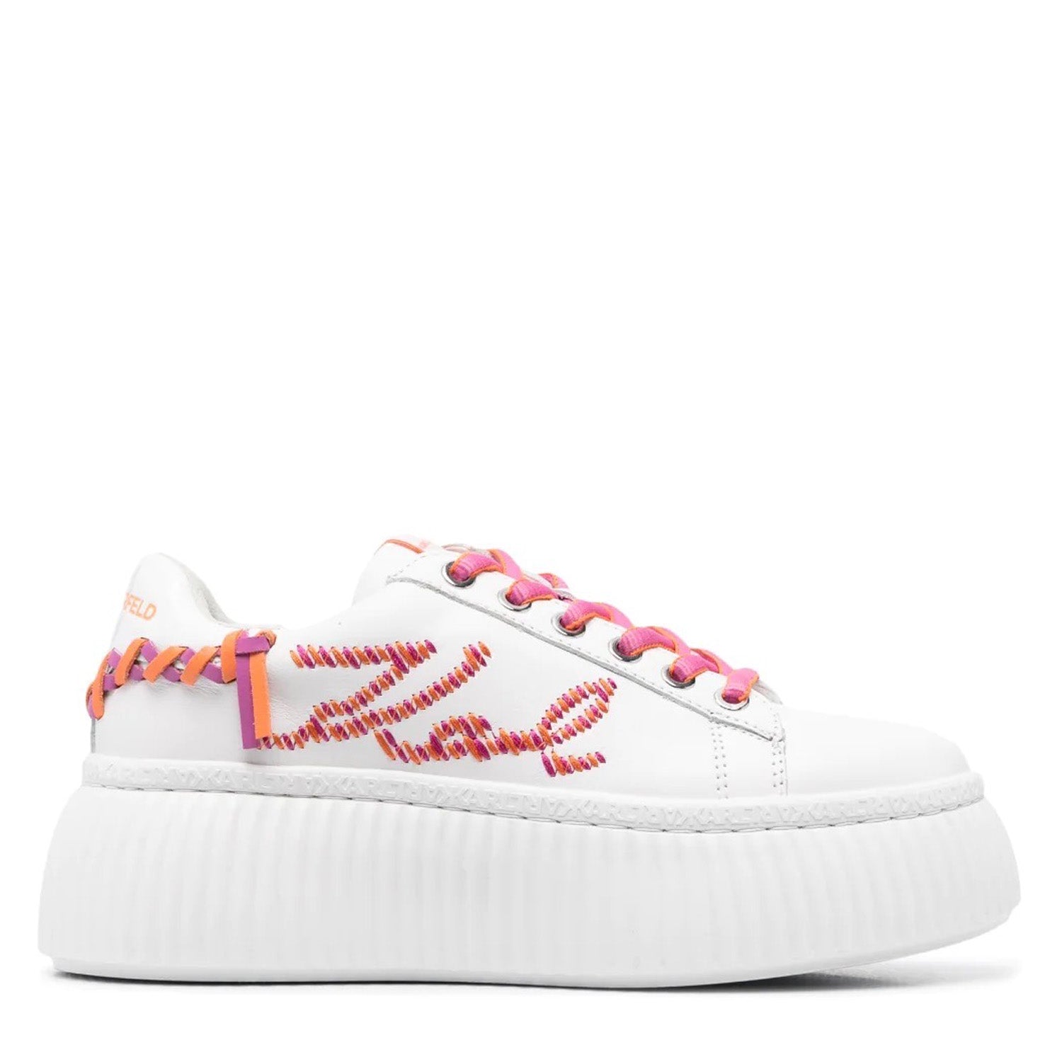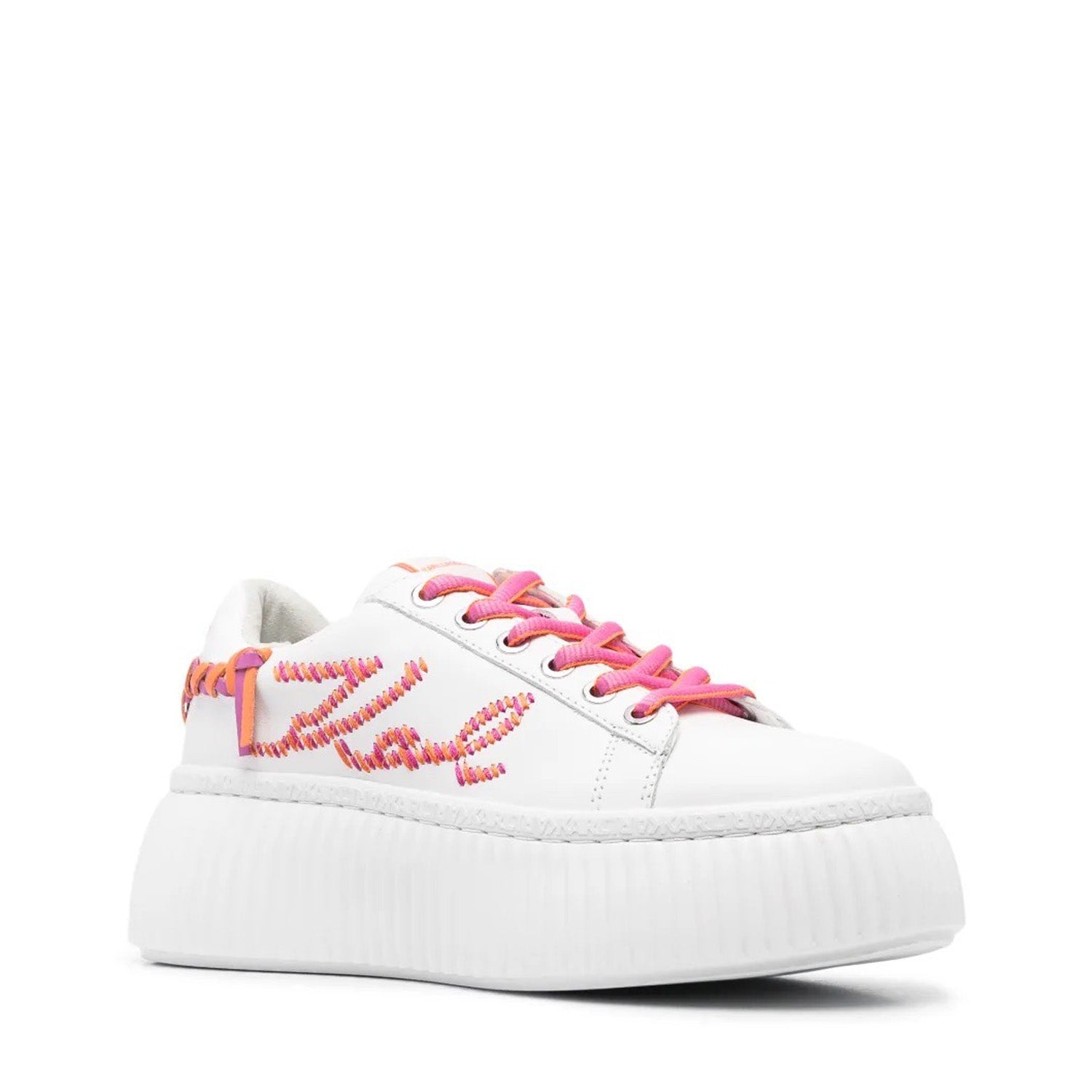 logo-embroidered low-top platform sneakers from Karl Lagerfeld featuring white, coral pink, calf leather, embroidered logo to the side, logo patch at the tongue, braid detailing, contrasting branded heel counter, round toe, front lace-up fastening, branded insole and platform sole.