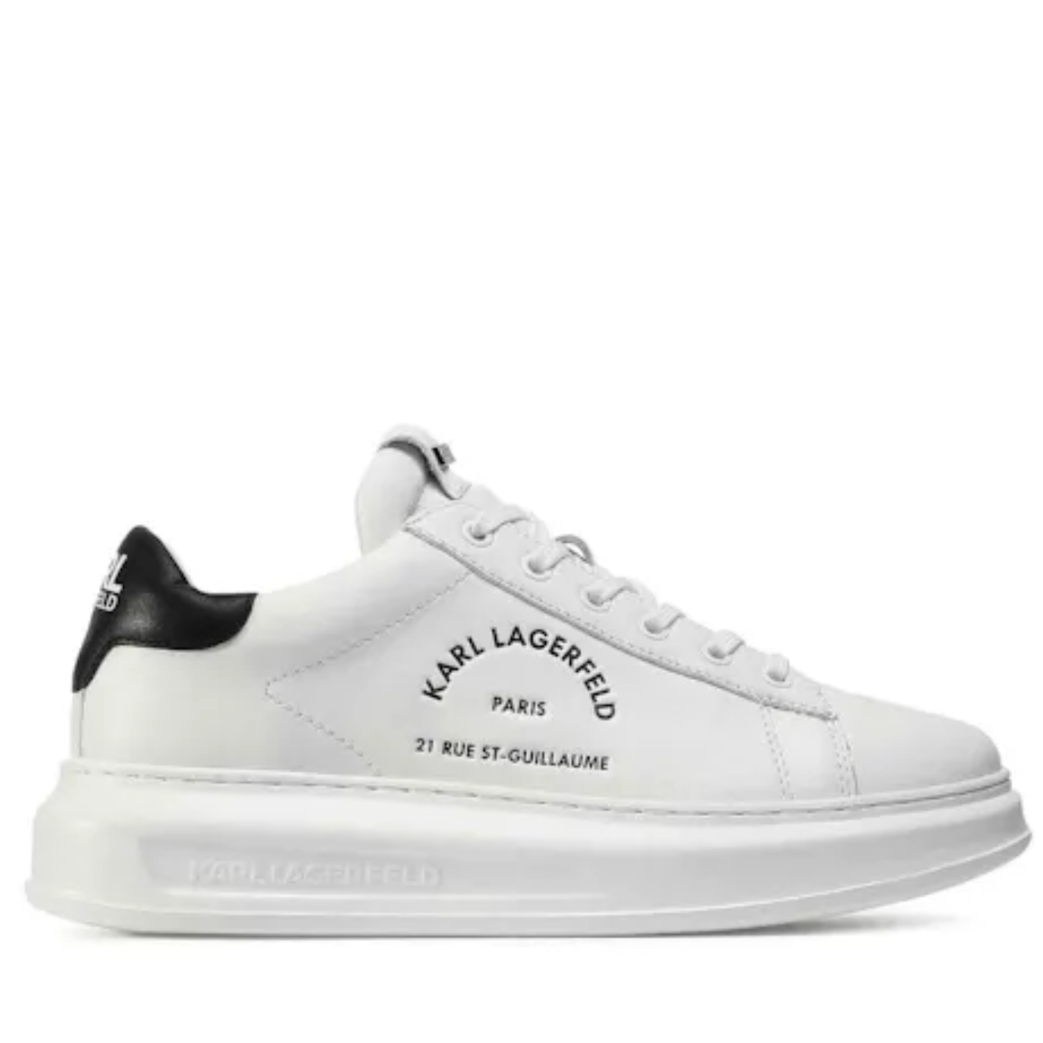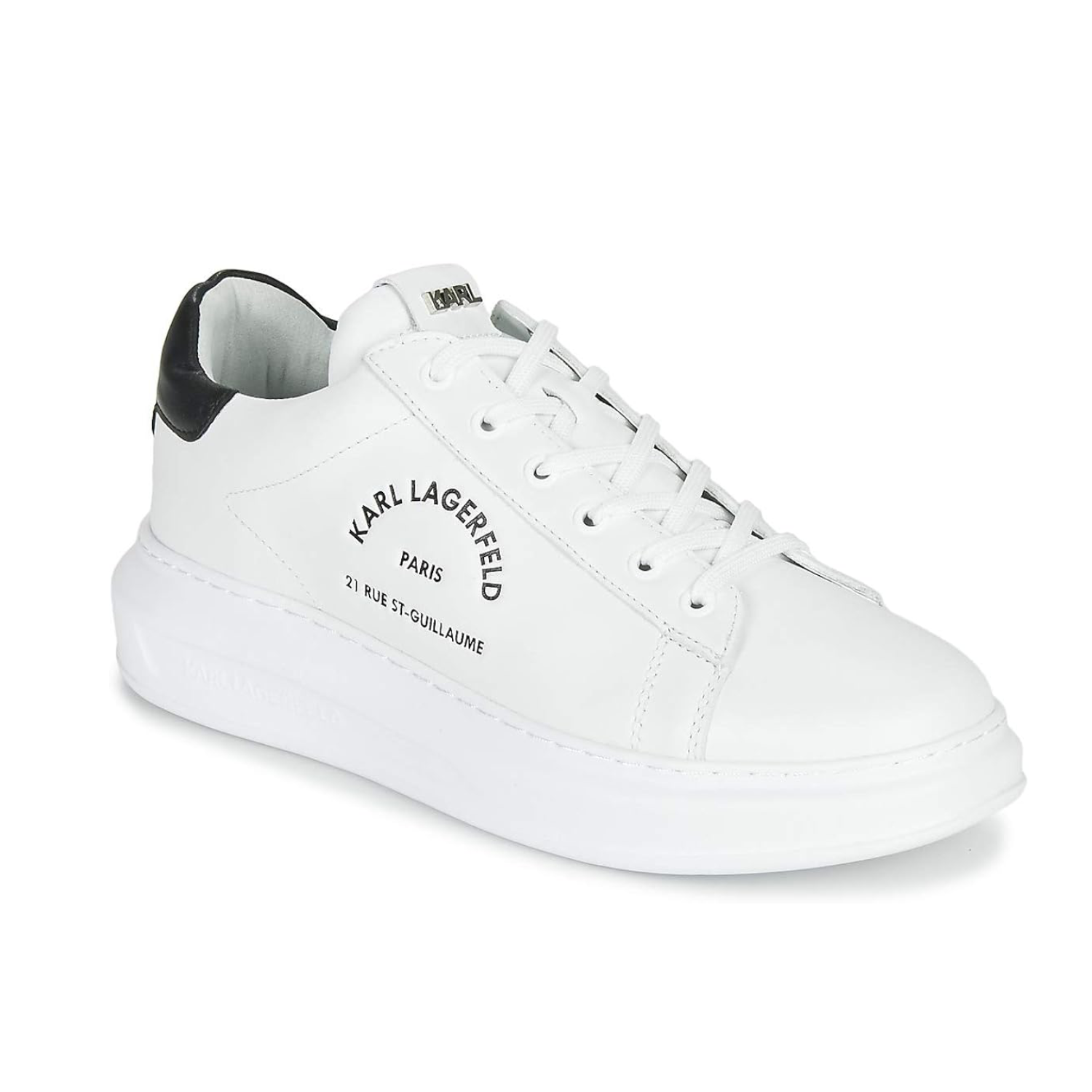 KARL's Rue St Guillaume low-top sneakers are detailed with the brand's headquarters in silver-tone logo lettering. Produced from smooth black leather, they feature a contrasting white heel counter and central lace-up closure.