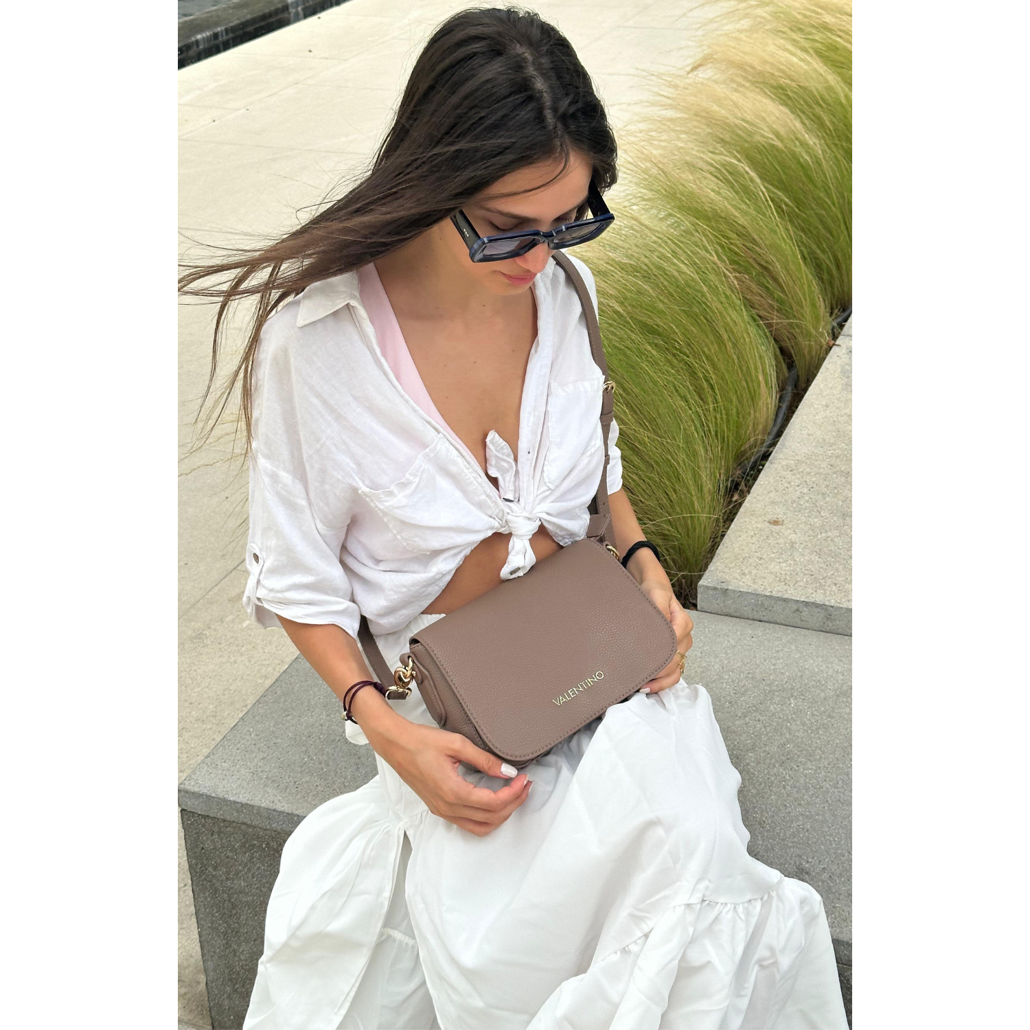 Shoulder bag from the Valentino Bags line, made of eco-leather. Inside it has an open pocket and a zipped pocket that optimize space. It features an adjustable and removable eco-leather shoulder strap that allows for customization. Finally, it is enriched by a front logo in relief and a hammered effect texture.