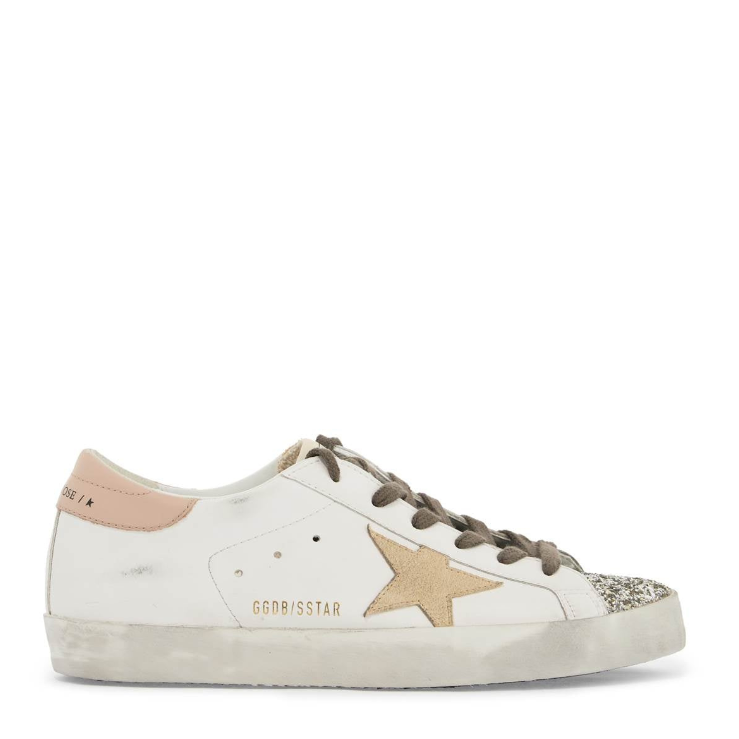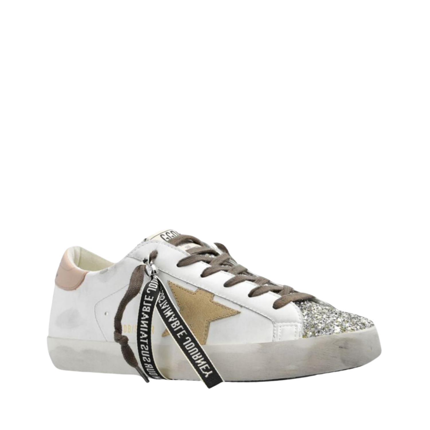 Experience style and sustainability with the the SUPER STAR GLITTER BIO STAR sneakers by Golden Goose. These eco-friendly shoes are made from bio-based materials, reducing their environmental impact. With a touch of glitter, these sneakers will elevate any outfit while reducing your carbon footprint.