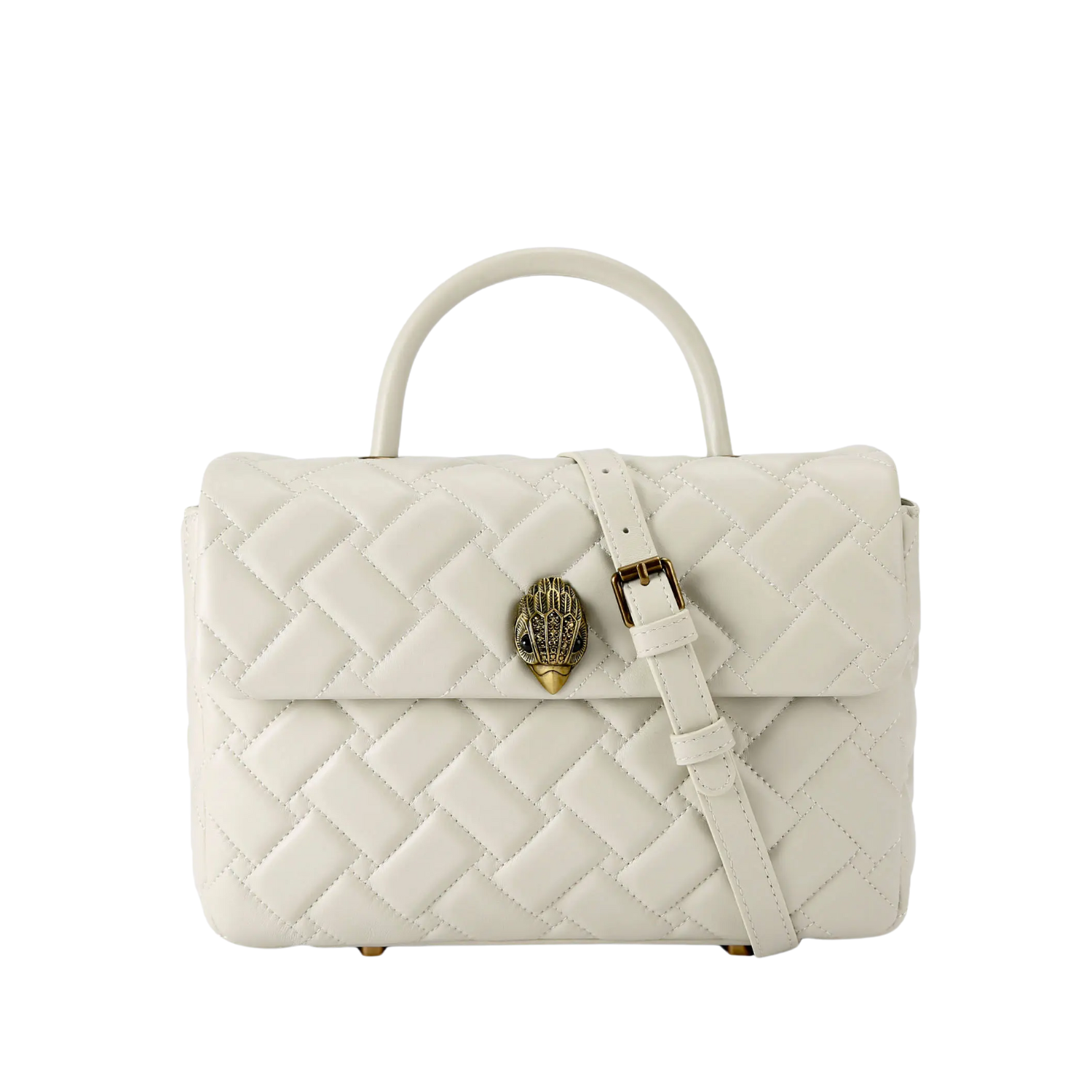 This Kensington Top Handle purse features a bone leather exterior with weave overstitch quilting design. There is a flat pocket on the back and antiqued brass eagle head on the front flap. This purse can be worn across the body or held with the structured top handle.