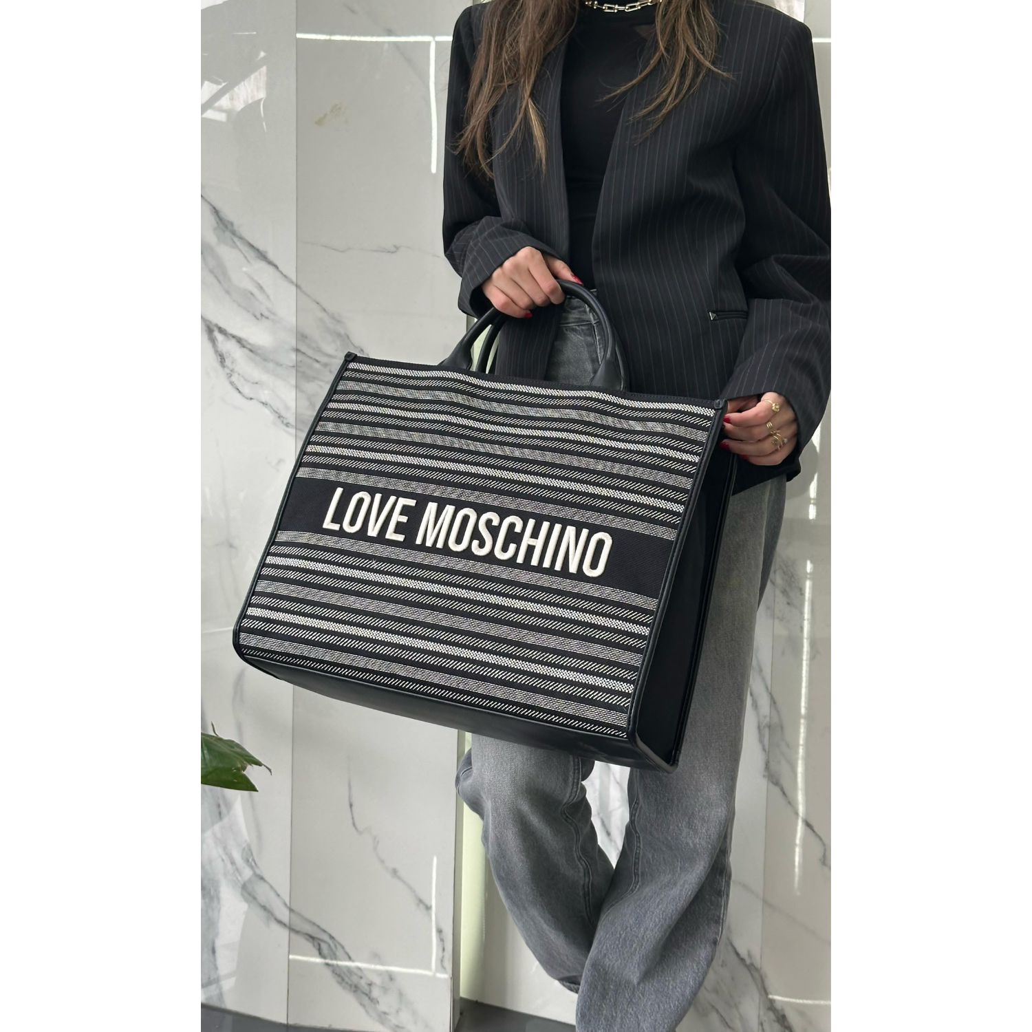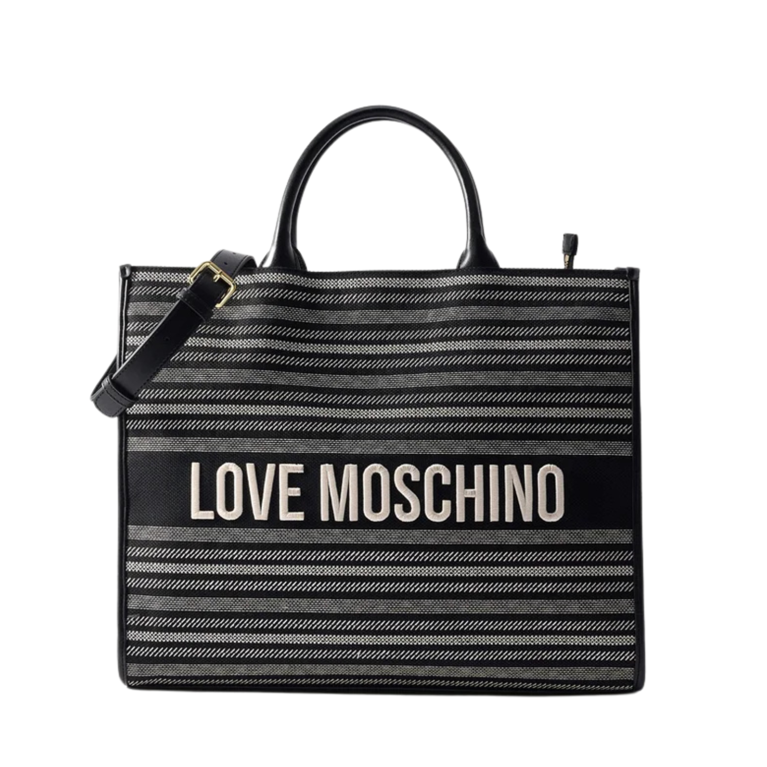 - Effortlessly chic, the Flower Tote Bag in canvas blends practicality with bold branding. Its structured silhouette features a striped woven design, complemented by contrast handles and an adjustable shoulder strap. Spacious yet lightweight, this versatile tote is perfect for carrying daily essentials with signature Love Moschino flair.