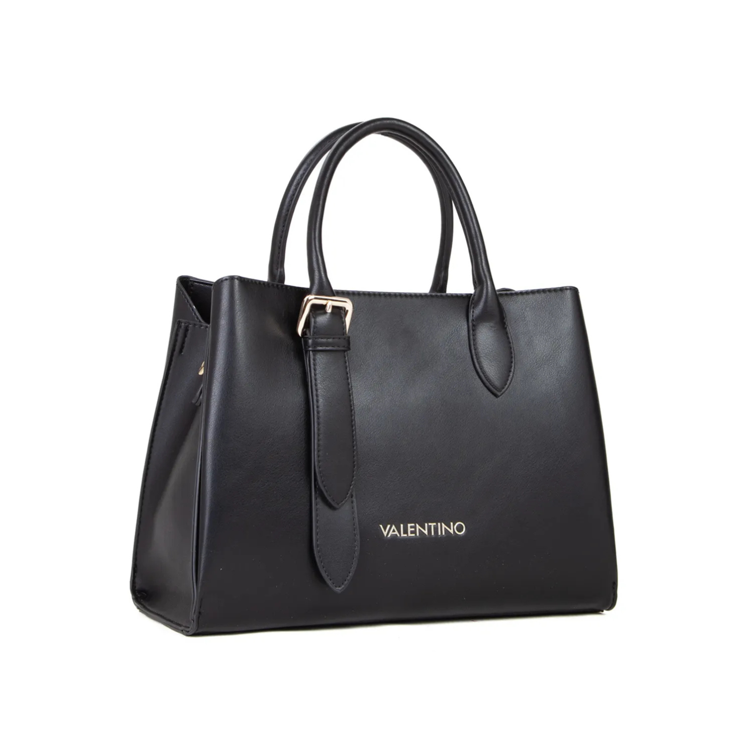 Mario Valentino Leather Black Tote Bag, with gold hardware logo lettering
