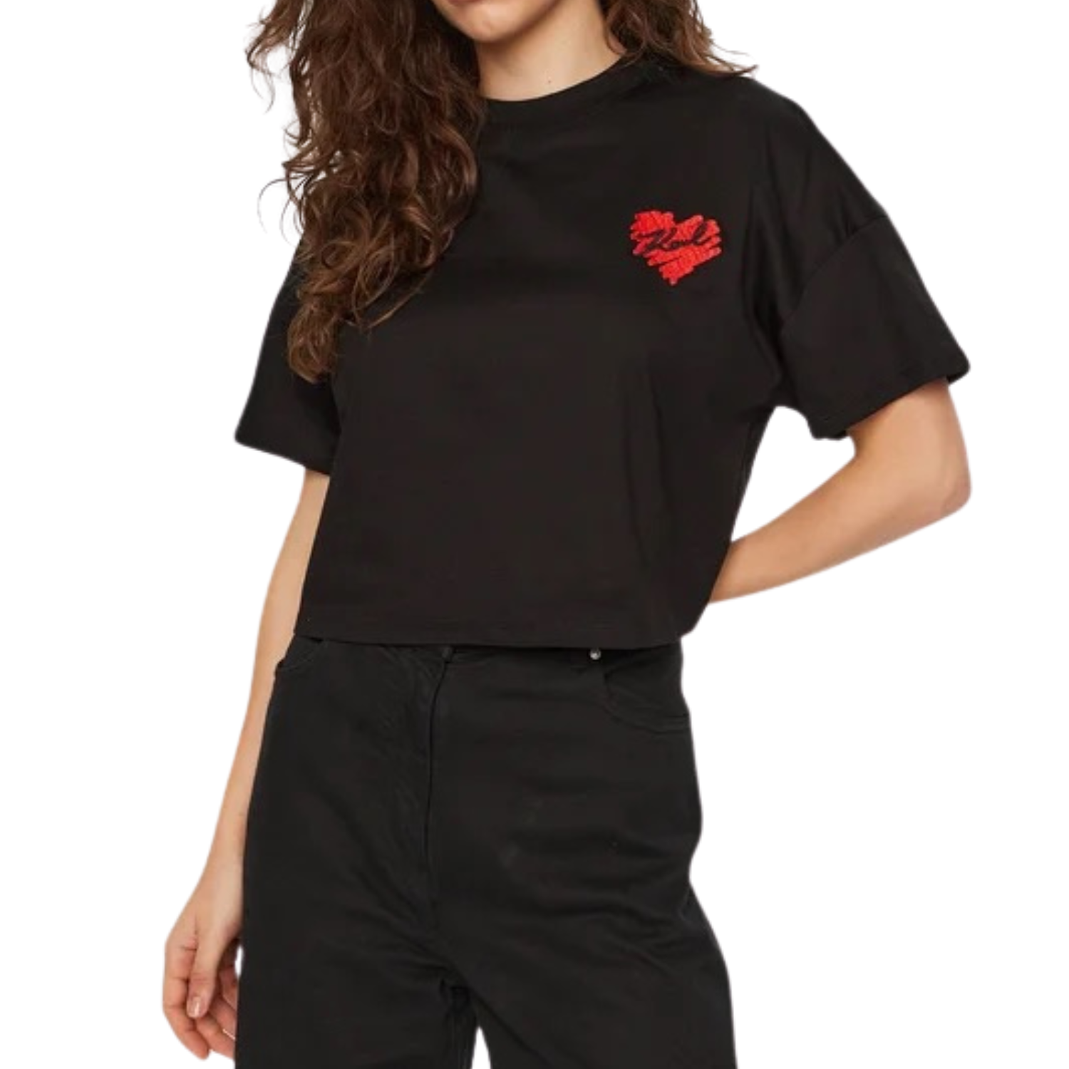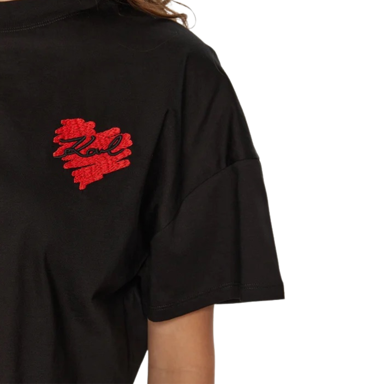 Cover up in style with these KARL LAGERFELD hearts. The black top features a red heart sign, giving you an edgy and trendy look. Made with high-quality materials and designed by a fashion industry expert, these sunglasses provide both fashion and function.