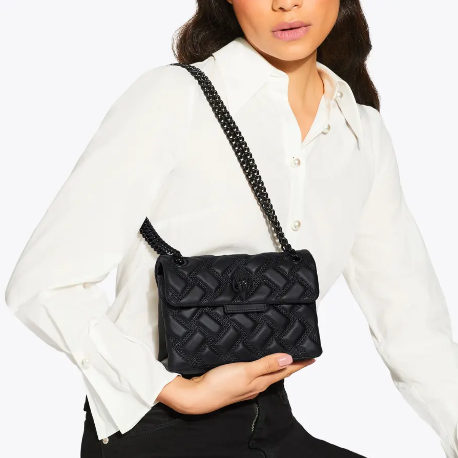 The Mini Kensington Drench Bag is crafted from a soft lambskin leather with signature parquet padded overstitch quilt with three rows of weave pattern. The black metal Eagle head features jet black crystals and black crystal eyes on the front flap.